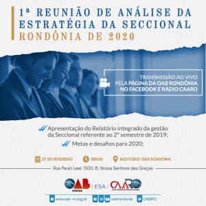 No dia 27 de fevereiro deste ano, a atual gestão comemora um ano em que foi empossa solenemente para o triênio (2019-2021). Neste dia, ocorrerá na sede da Ordem dos Advogados do Brasil – Seccional Rondônia (OAB/RO), a partir das 08h30, a 1ª Reunião de Análise da Estratégia (RAE) de 2020 da Seccional. Na ocasião será apresentado o 2º relatório integrado da gestão referente ao segundo semestre de 2019.