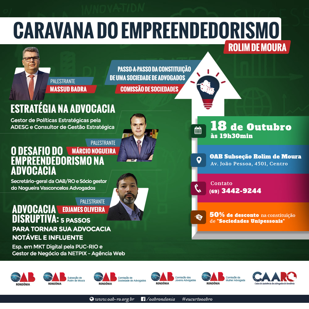 A Ordem dos Advogados do Brasil – Seccional Rondônia (OAB/RO) realizará, na próxima quarta-feira (18), os trabalhos da Caravana do Empreendedorismo na Advocacia, na Subseção de Rolim de Moura. A iniciativa, que será levada a todas as 18 subseções do estado, conta com presença confirmada do conselheiro federal da Seccional e ouvidor nacional da OAB, Elton Assis, e do conselheiro federal por Rondônia e corregedor nacional adjunto do Conselho Federal, Elton Fülber.