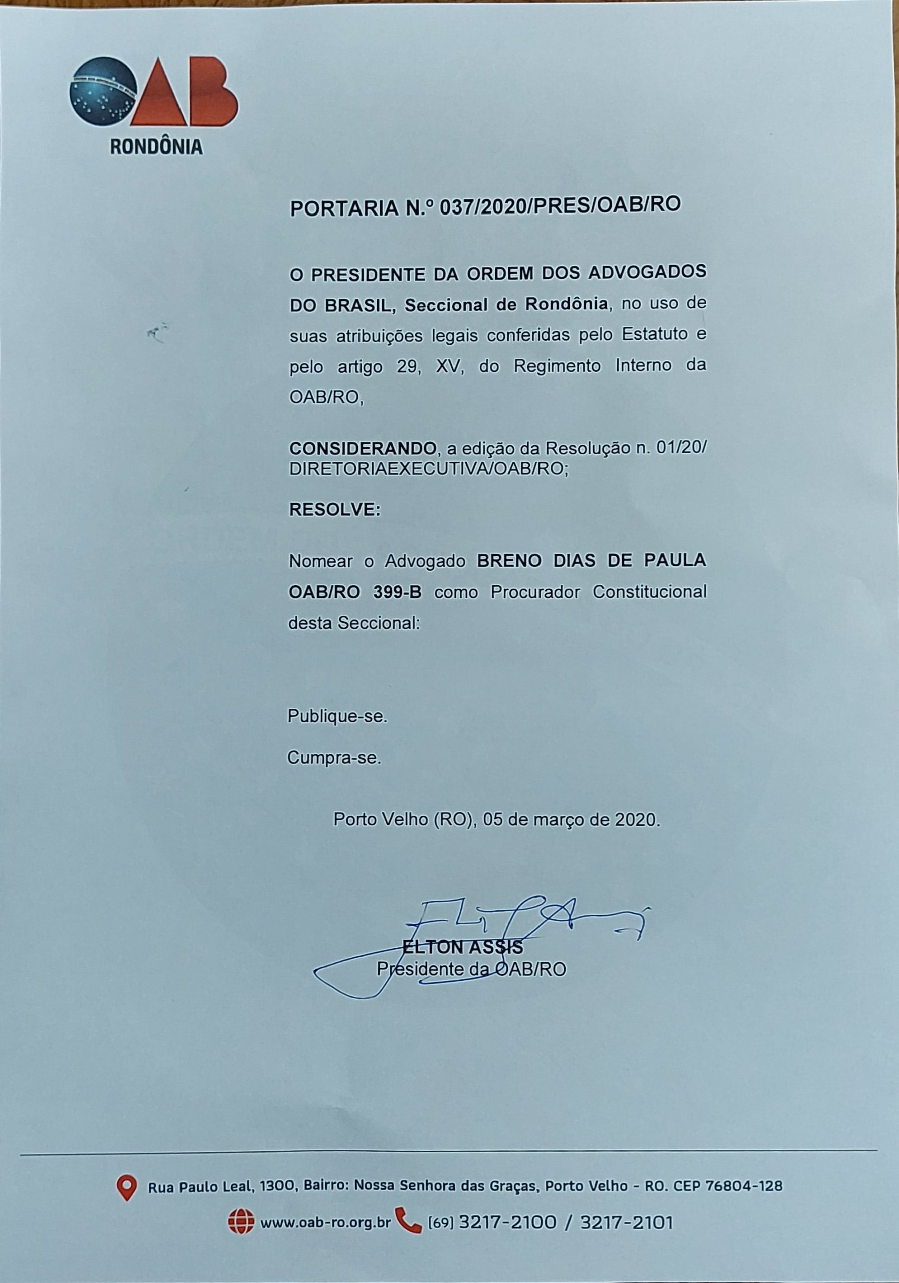 Breno de Paula é advogado há 20 anos, Doutor e Mestre em Direito pela UERJ, e atualmente também preside as Comissões de Direito Tributário da Seccional de Rondônia e de Estudos Constitucionais da Seccional. “Agradeço a confiança depositada pelo presidente Elton Assis. Temos muito trabalho pela frente”.