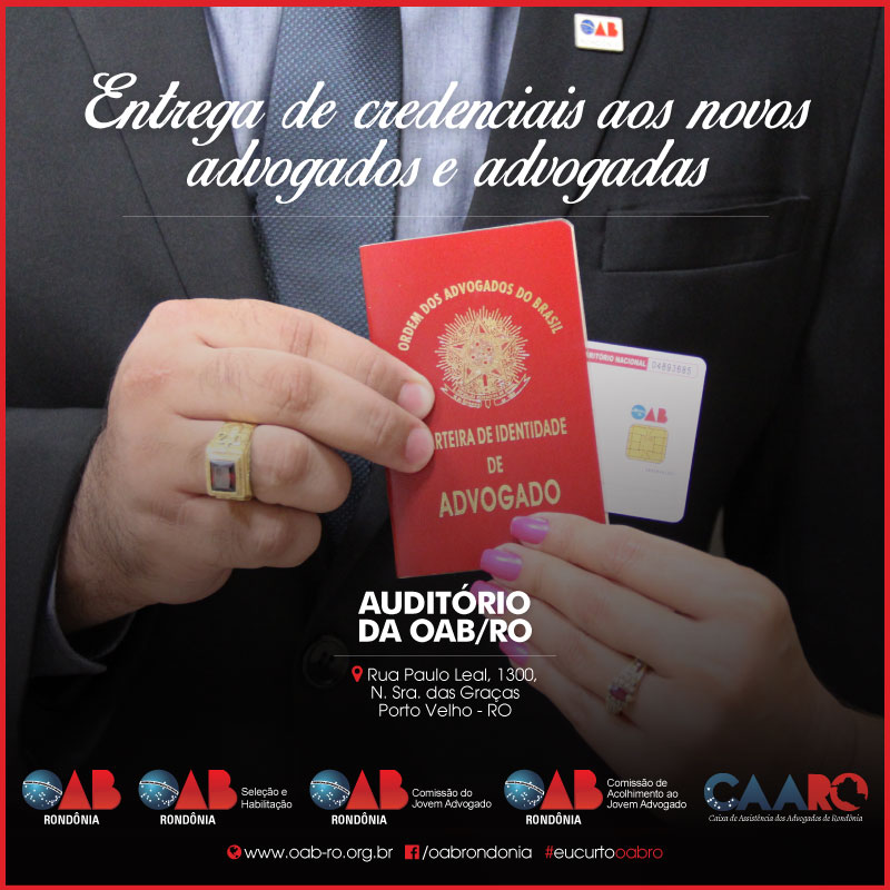 A Seccional Rondônia da Ordem dos Advogados do Brasil (OAB/RO) realiza nesta segunda-feira (26), em Porto Velho, a solenidade ordinária de entrega de credenciais aos novos profissionais da advocacia. Como parte da programação, a Comissão de Acolhimento ao Jovem Advogado (Caja) promove a Sessão de Acolhimento, que inclui palestras e apresentação da estrutura da sede da OAB/RO e da Caixa de Assistência dos Advogados de Rondônia (Caaro).